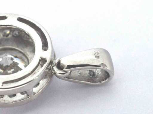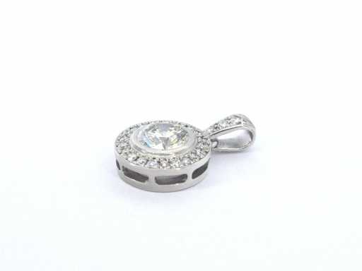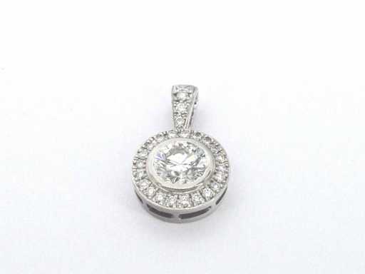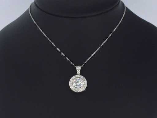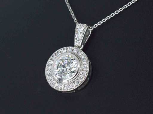 Diament: naturalny; Ilość: 1 sztuka; Cięcie: Brilliant cut; Waga (karat): 1,20 karat; Kolor: G; Czystość: VVS; Jakość cięcia: Bardzo ładna; Diament (drugorzędny): Diamenty; Liczba diamentów: 24 pionki; Cięcie: Brilliant cut; Waga (karat): 0,30 karata; Kolor: F; Czystość: VVS; Klejnot: Wisiorek (z wyjątkiem naszyjnika); Waga: 2,7 uncji; Materiał: 18k złota (750); Stan zdrowia: Nowy; Pakowanie: Luksusowa szkatułka na biżuterię; Wyjaśnienie: Jakość została zaczerpnięta z raportu dotyczącego przedmiotu. Wycena to ocena certyfikowanego dealera diamentów, oparta na cenach konsumpcjalnych; Cena konsumencka: € 35 000