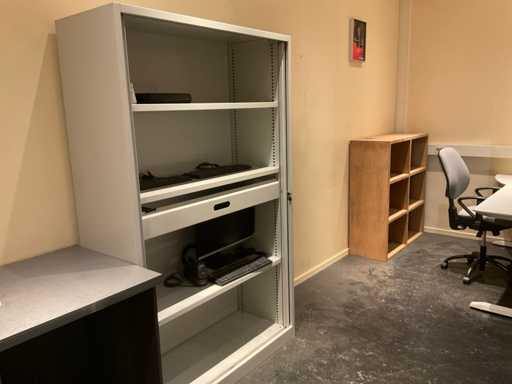 Składa się z biurka, krzesła biurowego, stołu biurowego, szafki z drzwiami roletowymi z zawartością, szafki z otwartą komorą, banera reklamowego, tablicy suchościeralnej, malowania