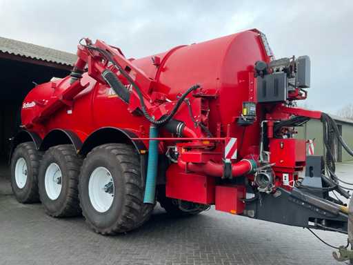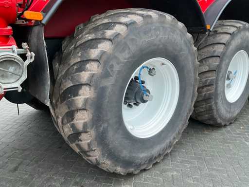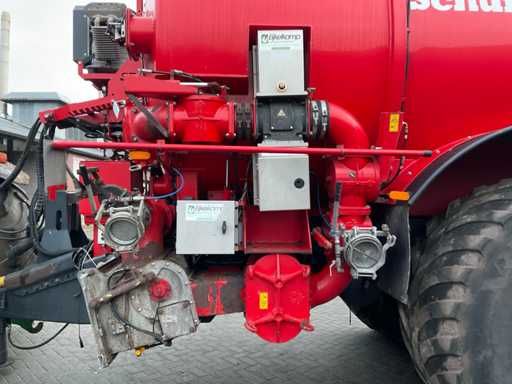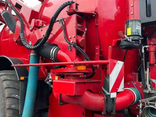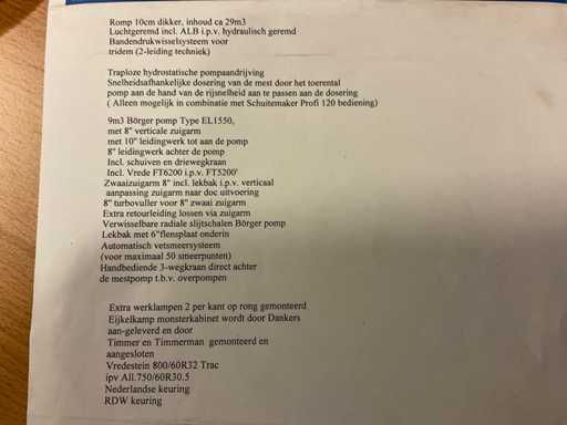 40 km/h. Średnica kadłuba 2300 mm, hamulce pneumatyczne, w tym ALB, bezstopniowy napęd pomp hydrostatycznych, dozowanie obornika zależne od prędkości poprzez dostosowanie prędkości pompy do dawki zgodnie z prędkością jazdy. Zbiornik jest ocynkowany i lakierowany. Wyposażony w cylinder ciśnieniowy na górze, pompę Börgera typu 9m3 EL1550, pionowe ramię ssące 8", rury 10" do pompy, rury 8" za pompą, zamki i zawór trójdrożny, szafę krojniczą typu Vredo FT6200, wahadłowe ramię ssące 8", turbo 8" z turbo do 8" ssącego, dodatkowe obciążenie linii zwrotnej przez ramię ssącą, wymienne obudowy promienisowe pompy Börgera, płytkę kroplową z 6" kołnierzem na dole, automatyczny system smarowania dla maksymalnej. 50 punktów smarowania, ręcznie obsługiwany zawór trójdrożny bezpośrednio za pompą do pompowania, dodatkowe oświetlenie robocze, skrzynka sterująca Schuitemaker Profi 120, skrzynka sterująca podwójnym systemem zmiany ciśnienia powietrza, przygotowany system ważenia, oś podnosząca oś przedniej, oś elektrohydrauliczna sterowana przednią i tylną. Dokumentacja dostępna.