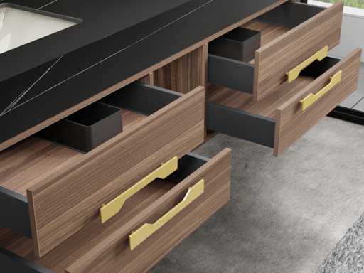 Typ: MBY-315-WM. Wymiary: zestaw dla 2 osób: 1 * Meble do umywalki - 1500x550x430mm, 1 * Szafka lustrzana - ok. 1500x160x700mm. Wyposażony w: system miękkich szuflad zamknięcia: 4 solidne metalowe szuflady - czarne krany z wysuwanymi odpływami (chrom) - złote metalowe uchwyty - lustro z: dotykowym oświetleniem LED w 3 kolorach, ściemnianym zegarem cyfrowym + termometrem, Bluetooth + głośnikami, technologią przeciwmgielną, bezmiedziową - gotowe meble do umywalki.