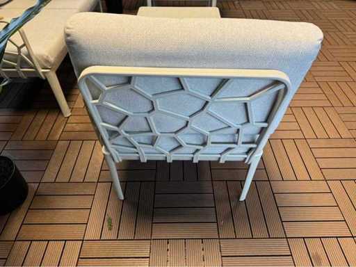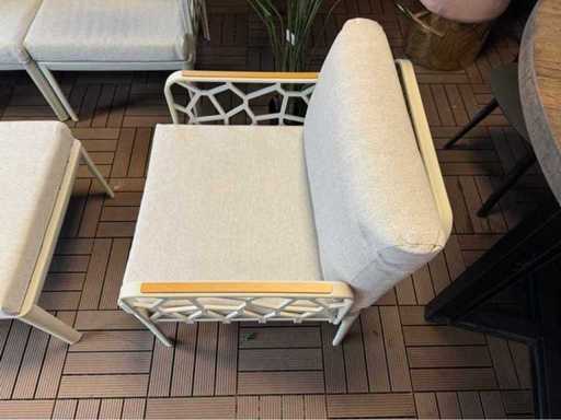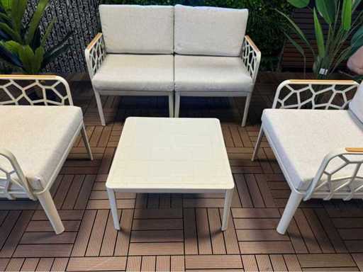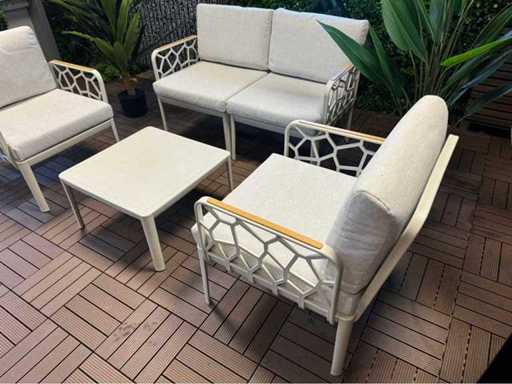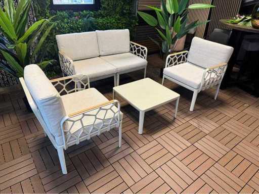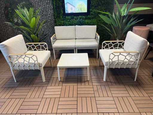 Nieużywany zestaw wypoczynkowy; wyposażony w 2 krzesła, sofę dwuosobową, pojedynczy stolik; w tym poduszki na zdjęciach; Jest w pudełkach