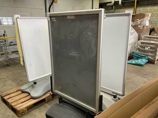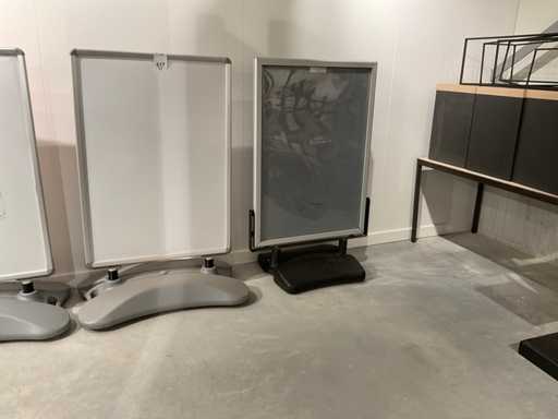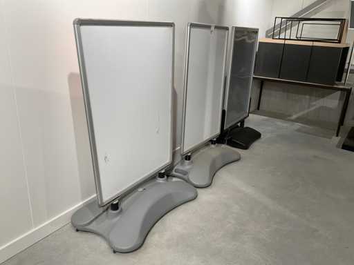 Wyposażony w obciążoną podstawę i kółka po jednej stronie, o rozmiarze plakatu około 120x85 cm.