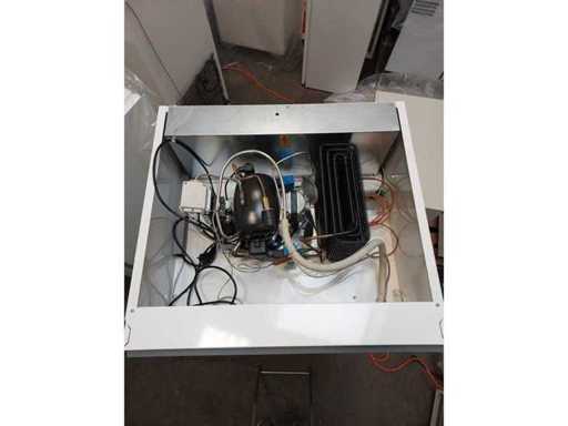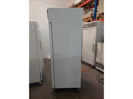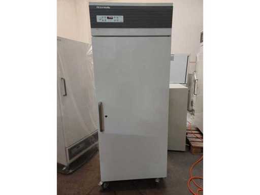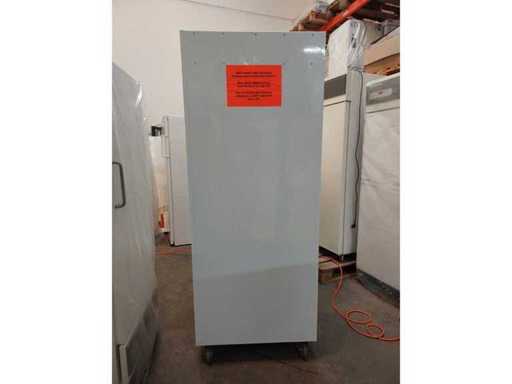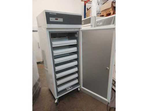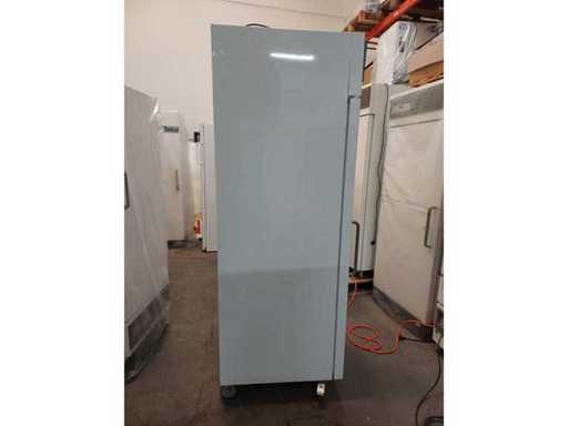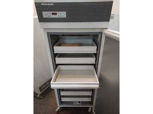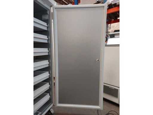 120 kg (net) mobile version (4 wheels). Outer housing made of powder-coated steel (white) Interior made of smooth aluminium with colourless protective coating. 7 plastic drawer housing insulation, 70 mm thick, made of high-quality, pressure-foamed material. Door (right band) with easily replaceable plastic magnetic seal frame, lockable. When the door is opened, there is no door overhang, so that any number of refrigerators can be placed close together. Door hinge on the right. Convection cooling with cross-flow fan, which switches off automatically when the door is opened. Automatic rapid defrosting by means of time-limited hot gas defrosting. Condensation evaporation in a heated stainless steel bowl under the bottom of the refrigerator. Control center protected by key switches with digital temperature display. Minimum/Maximum Temperature Storage. Visual and acoustic alarm signal in the event of temperature deviation with potential-free contact for connection to central control technology. Button for humidity selection, defrost indicator light and red warning light. Standard with RS 485 interface. Temperature control by means of electronic temperature controller. The temperature is automatically maintained regardless of changing outside temperatures, provided that the ambient temperature is at least about 3°C above the set indoor temperature. Chiller with refrigerant R 404a, forced-ventilated, hermetically sealed, energy-saving, low-noise, service-friendly, for 220-240 V alternating current, 50/60 Hz.