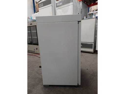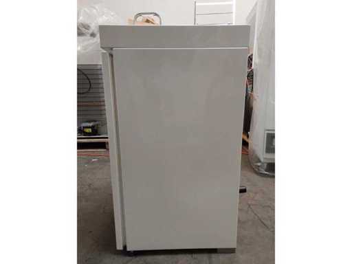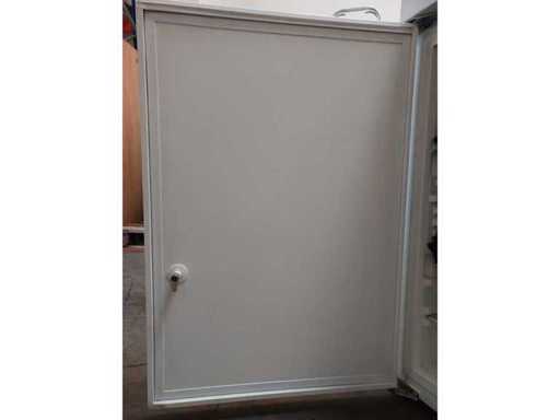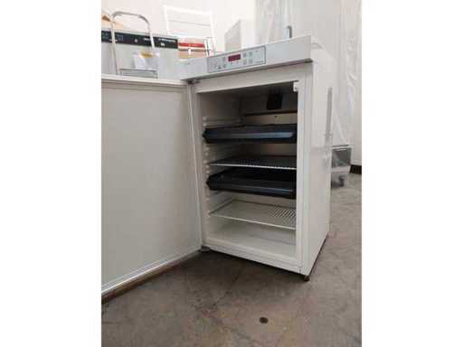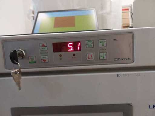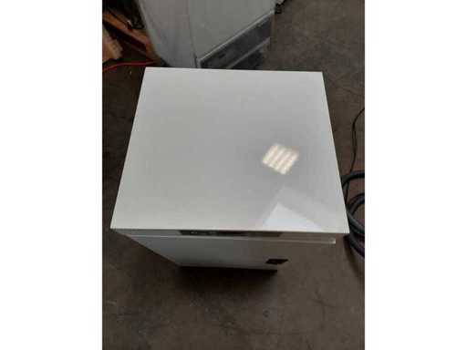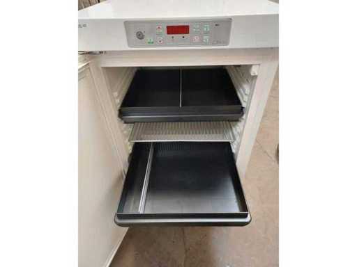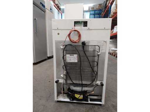 net 47 kg, gross 51 kg MED-125S. Outer housing made of galvanized sheet steel (rust-protected), with white, scratch-resistant powder coating. Device can be installed (fully integrable in furniture) Adjustable feet in the front area. Interior made of impact-resistant, white plastic with moulded-in cushions. Interior consisting of 2 drawers and 2 plastic-coated grates. Insulation 50 mm thick. Door (left-hand band) with replaceable plastic magnetic seal frame, lockable. Door hinge can be replaced. Circulating air cooling with axial fan that automatically switches off when the door is opened. Defrosting automatic, with thermal monitoring and time limit. Condensation evaporation in the refrigeration machine room. Electronic temperature control, tamper-proof by key switch. Membrane keypad with digital temperature display and minimum/maximum temperature memory. warning functions with visual and audible alarm signal in case of temperature deviation as well as power failure alarm; the monitoring unit remains in operation for about 72 hours thanks to a rechargeable battery. Alarm forwarding via potential-free contact possible, RS 485 interface for connecting PC-based temperature documentation. Freezing protection against sub-zero temperatures. Chiller statically ventilated, hermetically sealed.