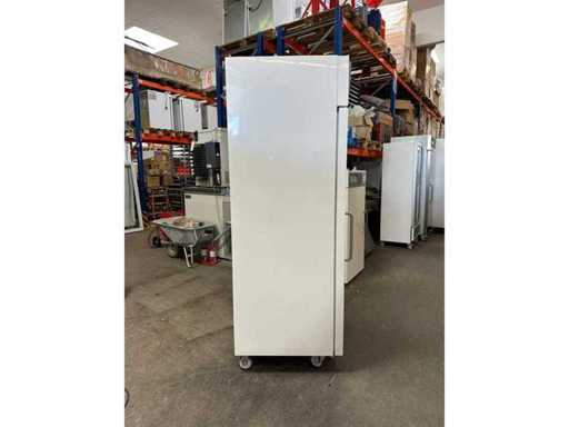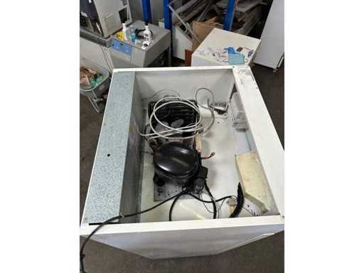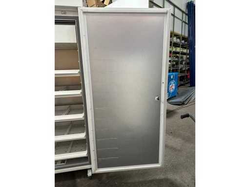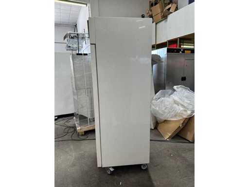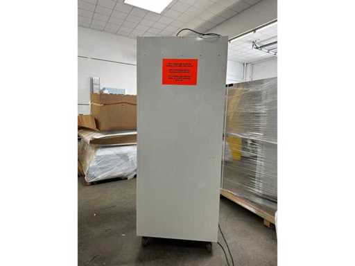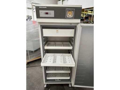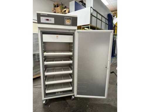 net 120 kg, gross 150 kg Mobile version (4 wheels, the front 2 with brakes) Outer housing made of galvanized sheet steel (rust protection), white, powder-coated. Interior made of smooth aluminium with colourless protective coating. 6 medication drawers on roller thrust guides. Insulation, 70 mm thick, made of high-quality, pressure-foamed and environmentally friendly material. Energy-saving due to special starch. Door with easily replaceable plastic magnetic seal frame, lockable. When the door is opened, there is no door overhang, so that any number of refrigerators can be placed close together. Door hinge on the right. Circulating air cooling with cross-flow fan, which switches off automatically when the door is opened, ensures uniform temperature control and reduces the physically induced temperature gradient to a minimum. Automatic hot gas rapid defrost. Condensation evaporation in a heated stainless steel bowl under the bottom of the refrigerator. Control center with digital temperature display. Visual and acoustic warning in case of temperature deviation. Potential-free contact for connection to central control system. Humidity selection button. Red warning light when the safety regulator is triggered. Temperature control by means of electronic temperature controller. Safety regulator against sub-zero temperatures. Chiller, force-ventilated, hermetically sealed, energy-saving, low-noise, service-friendly, for 220-240 V AC, 50/60Hz.
