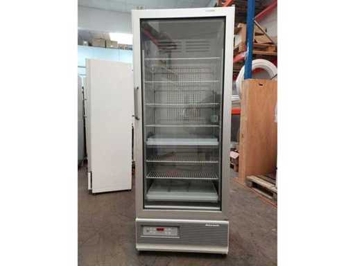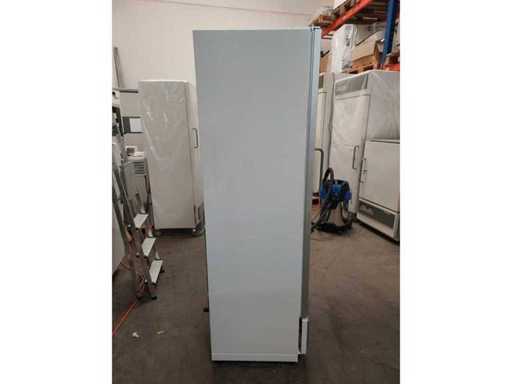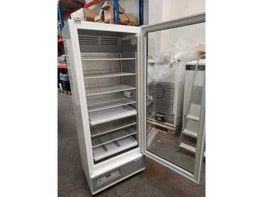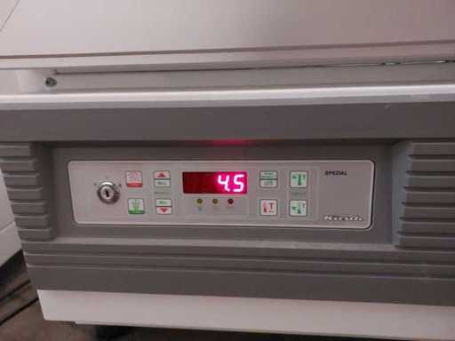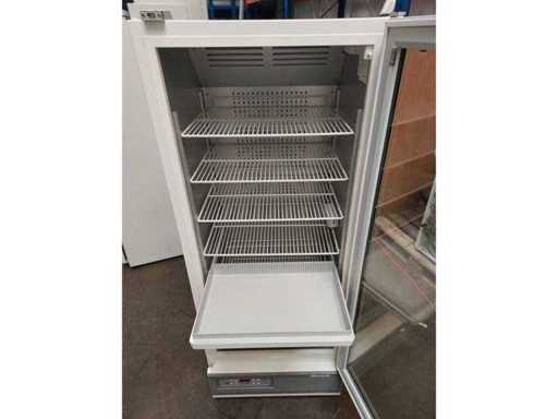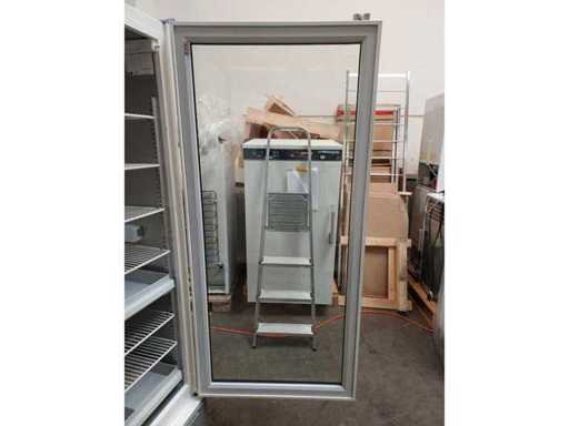 6 grates, 2 plastic drawers, insulation 55 mm thick. Door with easily replaceable plastic magnetic seal frame, lockable. Door hinge on the right, replaceable. Convection cooling with cross-flow fan, which switches off automatically when the door is opened. Defrosting automatic, with temporal and thermal monitoring. Condensation evaporation in the refrigeration machine room. Electronic temperature control. Control center with key switch and membrane keypad, digital temperature display. Minimum/maximum temperature storage. Visual and audible alarm signal in case of temperature deviation. Potential-free contact for connection to the central control system and RS 485 interface. Chiller statically ventilated, hermetically sealed, energy-saving, low-noise, easy to service, for 220-240 V AC. 50/60 Hz. Available length of the plug cable approx. 1.8 m.