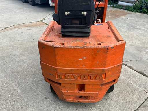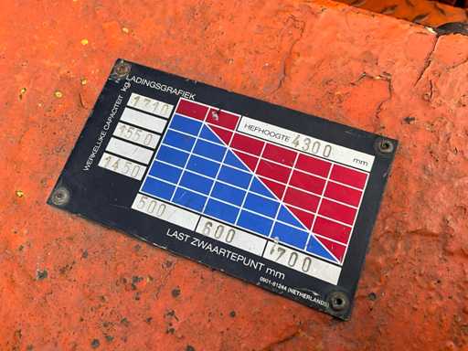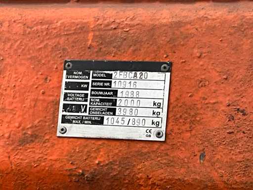 Solid Toyota electric forklift from 1988, with a lifting height of no less than 4.3 meters and a lifting capacity of up to 2,000 kg. Equipped with a clear load diagram for different centers of gravity. The hourly reading is approx. 4,649 hours.