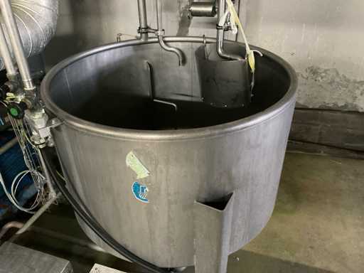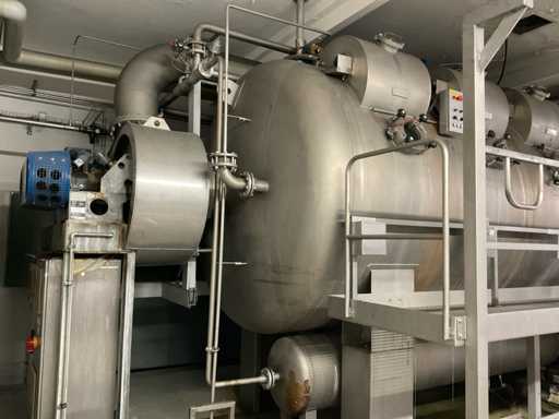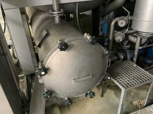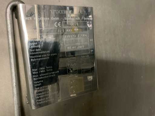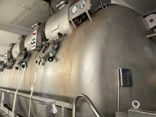 min/max temperature 150 degrees, max. pressure 3,5 bar, volume 24600 liter, test pressure 5,25 bar, main switch cabinet with SedoThreepoint, Sedomat 8015 touchscreen, intended use dyeing, product group 2, with injection filter, pump, open stainless vessel diam. 1050 mm x 650 mm, various valves, combined piping, stainless walking platform, stairs, power cabinet side placed, infeed reel, surface/dimension needed 8000 x 9000 mm, height approx 4000 mm, Then49, reference number #10340