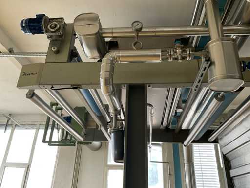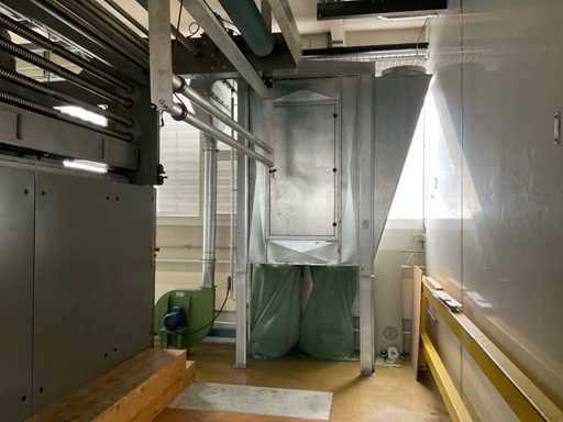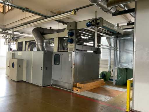 with in-reel stand, working width approx. 2000/1800mm, Enairgy central touch control screen, power cabinet and galvanized dust 2-fold filter installation with combined piping, chimney trough roof, blower, fan, total floorspace approx. 6000 x 12000 mm, reference number #10447