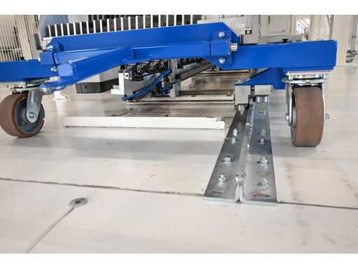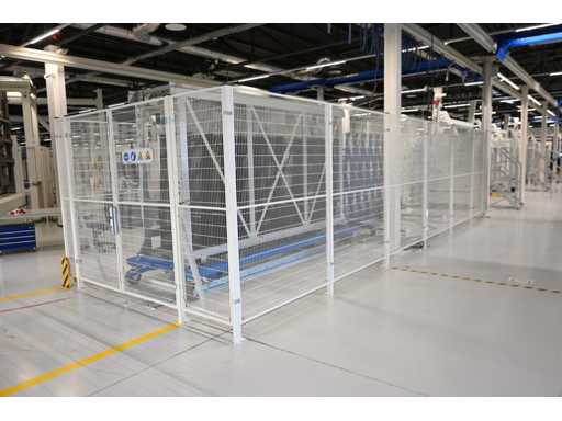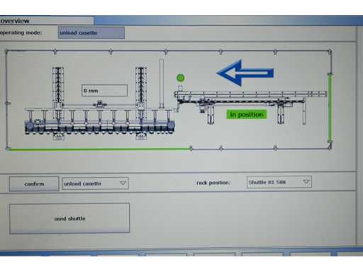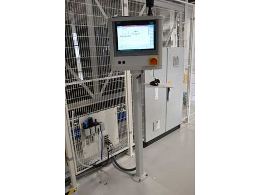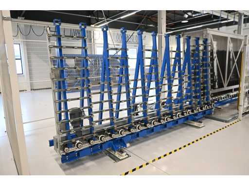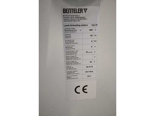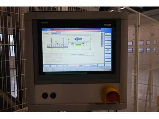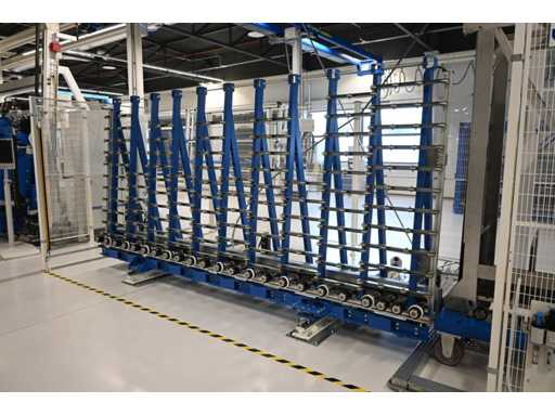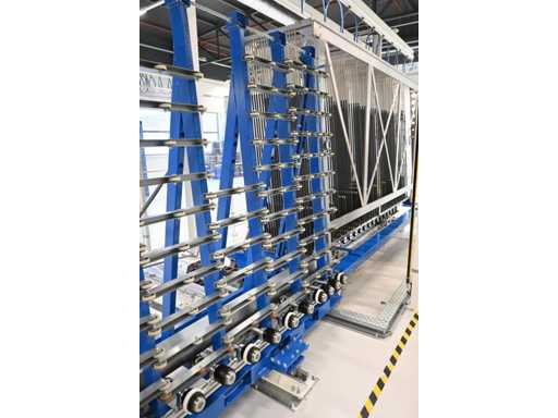Constă dintr-un transportor vertical de încărcare/descărcare Benteler (dimensiuni aprox. L425 x W200 x H220 cm) și 1 x stație de descărcare a sticlei Benteler (dimensiuni aprox. L375 x W80 cm). Echipat cu Siemens Simatic HMI Touch - control. Inclusiv gard mecanic cu sistem electronic de securitate laser Leuze. Investiția la mașini: 144.000 € excl. TVA.
