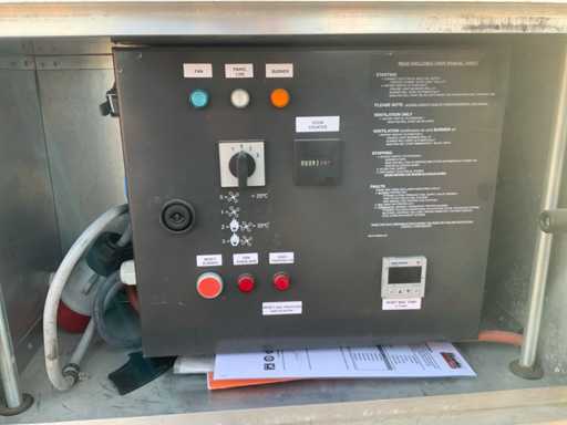 încălzire și ventilație; carcasă din oțel inoxidabil; panouri laterale detașabile; păcură / motorină arsă; conexiune rezervor extern de combustibil; debit volumic 13860 m3/oră; diametru ieșire aer 550 mm; consum la sarcină maximă 20,9 litri/oră; ore de citire 4103 ore; ridicarea ochilor; cărucior inferior echipat cu fante pentru furci pentru stivuitor; starea de lucru neverificată;