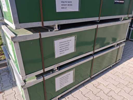 Dotat cu cort/adăpost de depozitare; sistem de ferme/tub de circumferință; Galvanizat; 2 uși; spațiu între arcade 152,5 cm; material 420 grame capac PVC; culoare albă; inclusiv manualul de asamblare; nefolosit în carcasă metalică