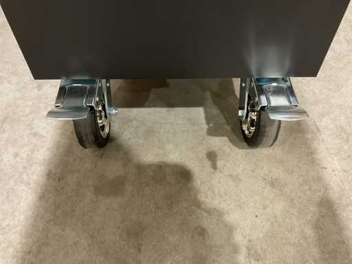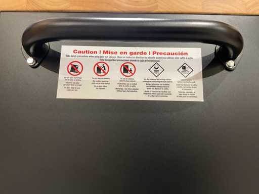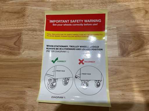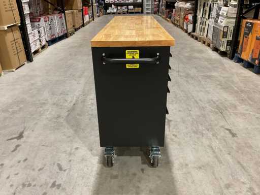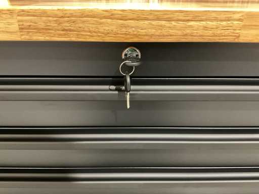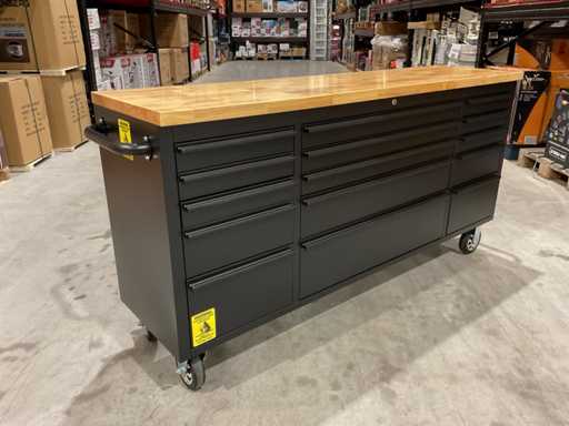 Echipată cu oțel cu pulbere neagră; 15 sertare; blat de lucru din lemn de 35 mm; 2 mânere; 4 roți de 6 inch, dintre care 2 roți cu frâne; încuiabil cu ajutorul unei chei; Neutilizat în cutie (dimensiuni transport 190x55x90 cm)