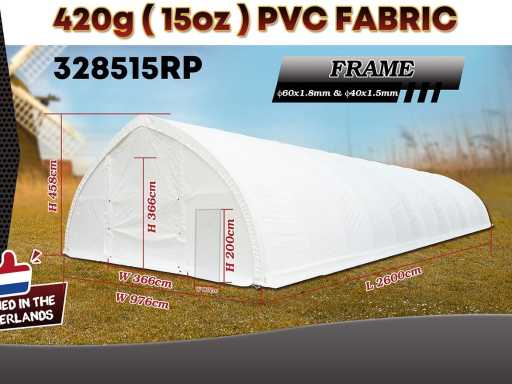 Dotat cu cort de depozitare / adăpost de depozitare; sistem de ferme/tub de circumferință; Galvanizat; ambele capete o ușă; material 420 grame capac PVC; culoare albă; inclusiv manualul de asamblare; nefolosit în cutie metalică (dimensiuni transport 303x75x126 cm)
