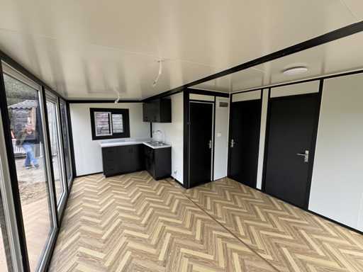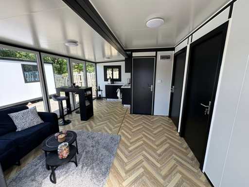 Echipat cu pereți și acoperiș izolați; 1 perete de sticlă; 2 dormitoare; living cu bucătărie de colț; baie cu duș, toaletă și chiuvetă; fiecare cameră dotată cu iluminat și prize de 230V; dulapul de contoare; podea din PVC; ferestre și uși din aluminiu; Blocabil; apa, electricitatea și scurgerile pot fi ușor conectate și pregătite; neutilizat și gata de transport (dimensiuni transport 590x220x248 cm, greutate 3700 kg)
