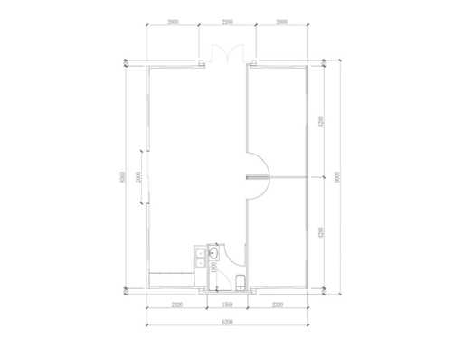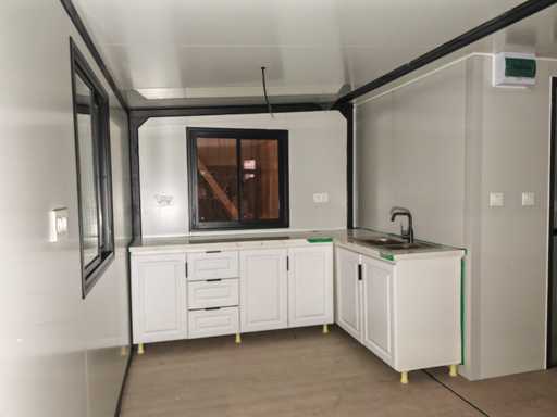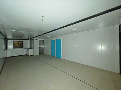 Echipat cu pereți și acoperiș izolați; 2 dormitoare; living cu bucătărie de colț; baie cu duș, toaletă și chiuvetă; fiecare cameră dotată cu iluminat și prize de 230V; dulapul de contoare; podea din PVC; ferestre și uși din aluminiu; Blocabil; apa, electricitatea și scurgerile pot fi ușor conectate și pregătite; neutilizat și gata de transport (dimensiuni de transport 900x220x248 cm, greutate 4500 kg)