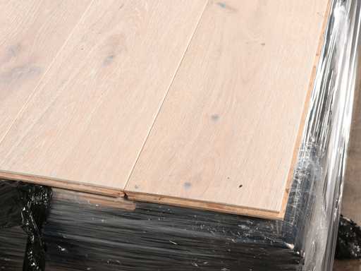 Easy to lay due to tongue and groove system, suitable for all types of floor and cooling heaters, contains short and long planks, floor is made of European oak wood, ready-made treated, note floor is unpacked contains loose planks, thickness 15 mm, top layer 3 mm, 1 pallet a 37 m2