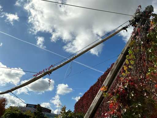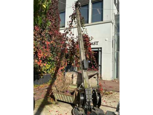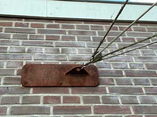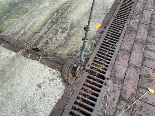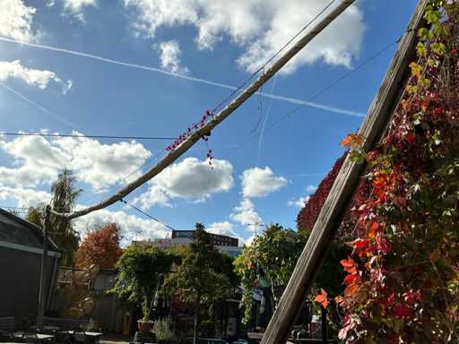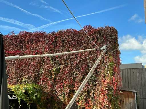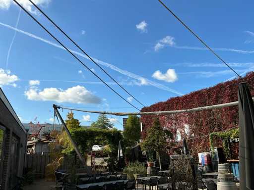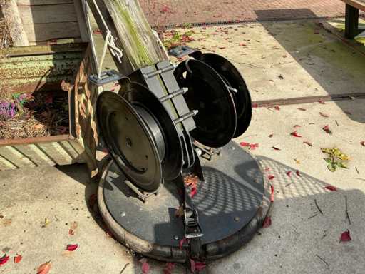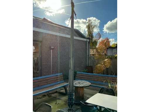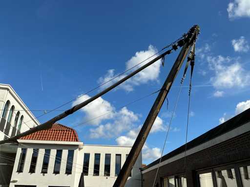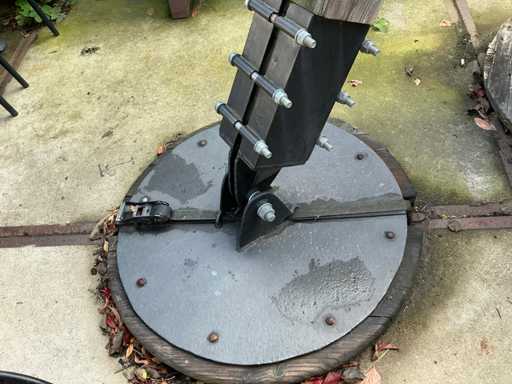 Format din 2x stâlp de lemn (620x18x18cm) pe picior Ø90cm; pânza poate fi rulată în jumătate din scripete; Deschidere aprox. 17m x 7m.