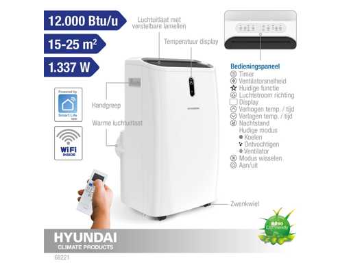 • Descoperă confortul suprem cu aparatul portabil de aer condiționat HYUNDAI eficient energetic. Uită de bâtaia de cap a telecomenzii și panoului de control – cu aplicația noastră Smart Life te poți bucura de și mai multă comoditate. Spune adio zilelor fierbinți de vară și întâmpină o temperatură plăcut și răcoroasă în casa ta. Datorită modului de noapte inteligent, poți avea parte de nopți liniștite fără să te chinui cu căldura, așa că te trezești odihnit și revigorat dimineața.