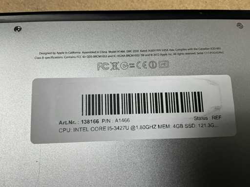 Apple, Mac Book Air (A1466), CPU: Intel Core i5-3427U @1.80GHz, MEM: 4GB, SSD: 121.3GB, no adapter ( cleaned and tested ) [ID: 138166]