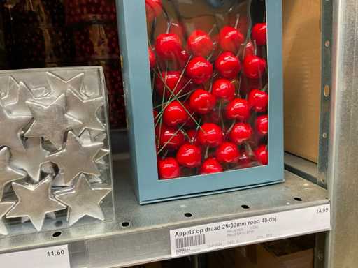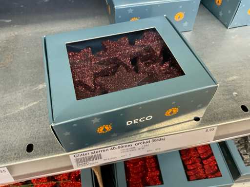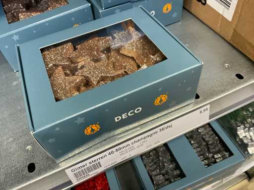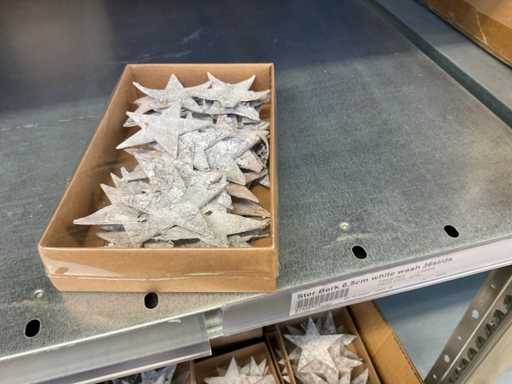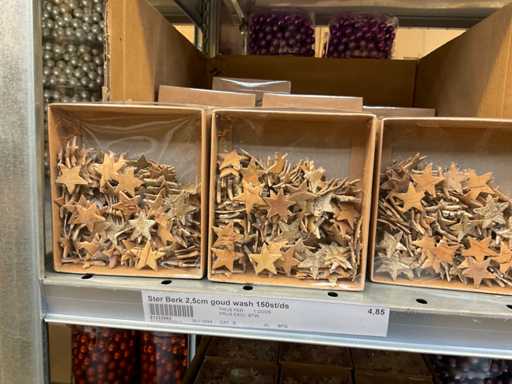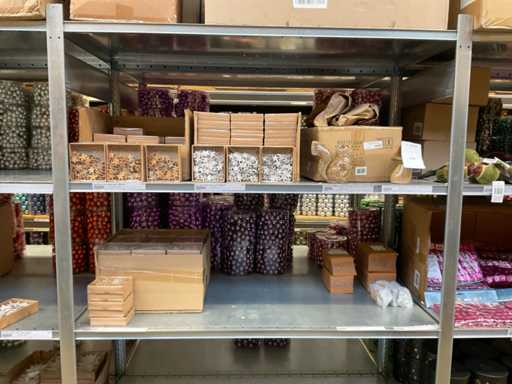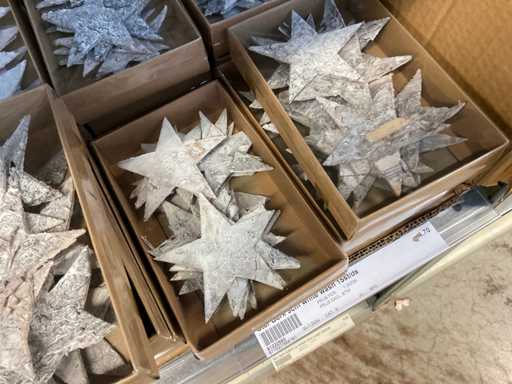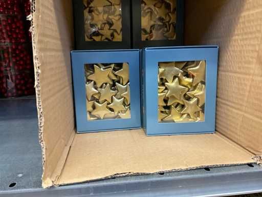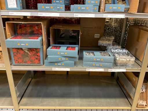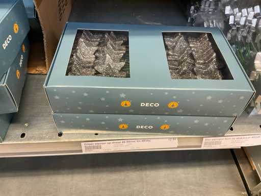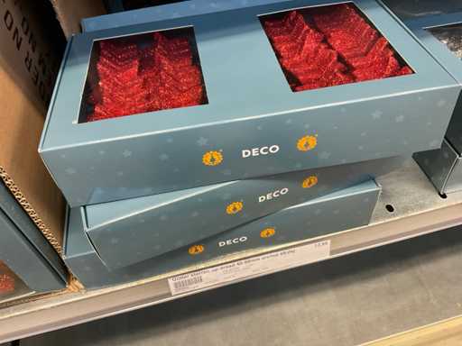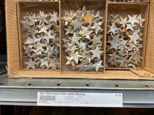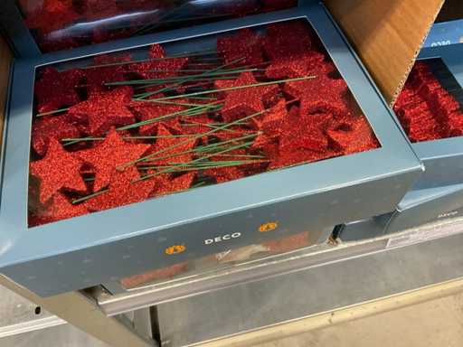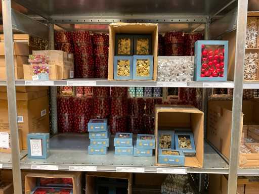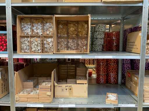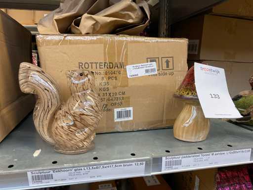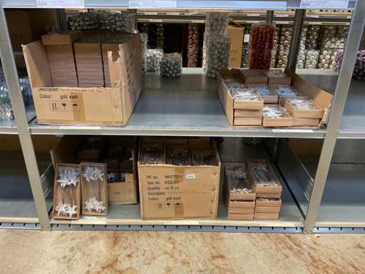 Constând din veveriță de sticlă și ciupercă, stele de lemn, mere deco, stele pe băț, toate în 3 secțiuni de rafturi.