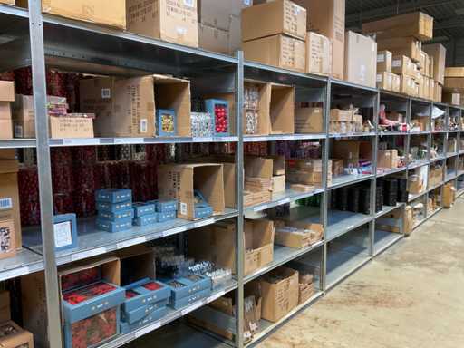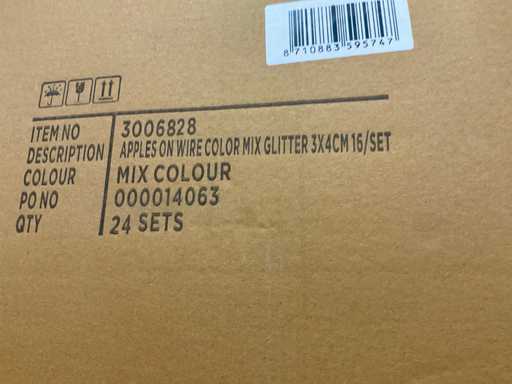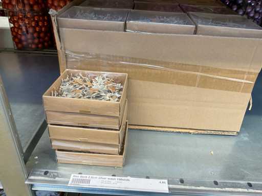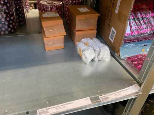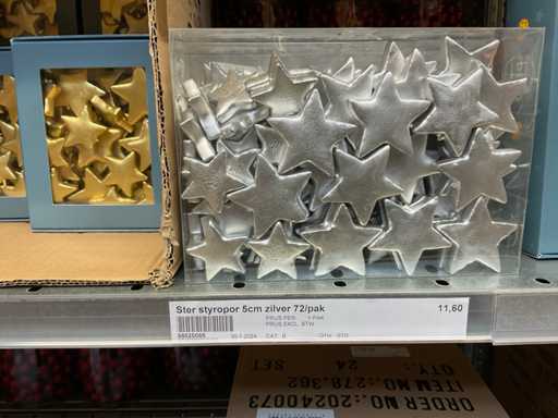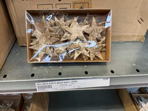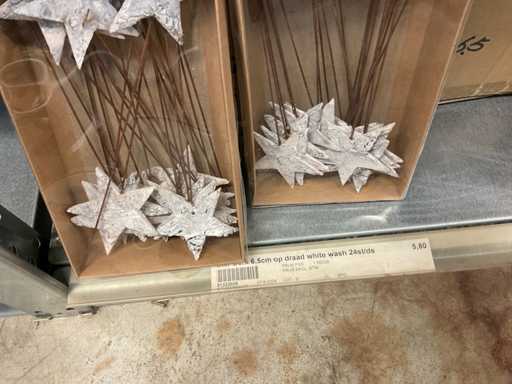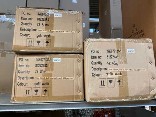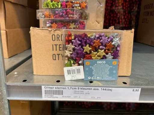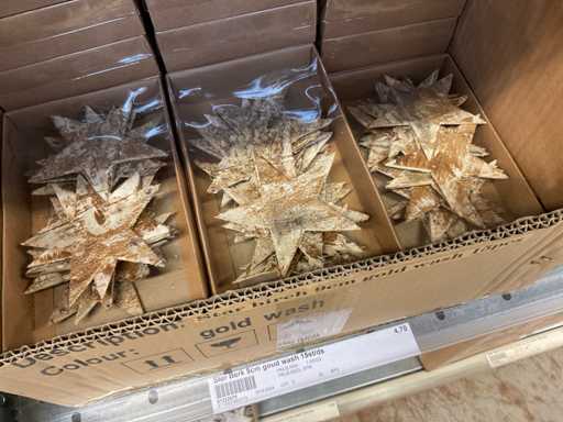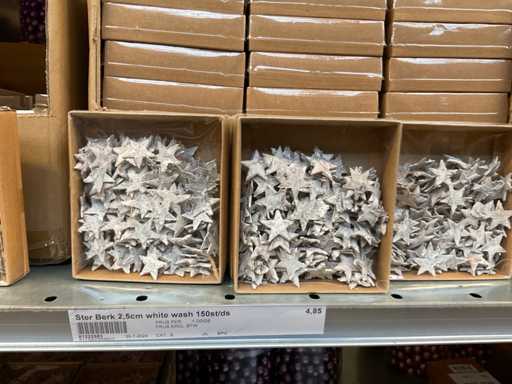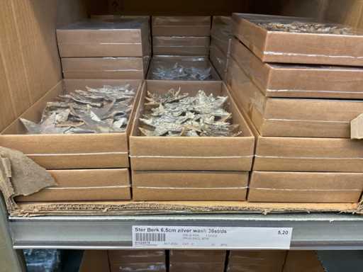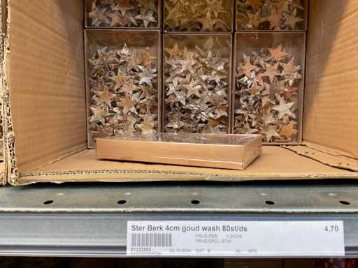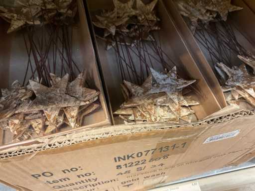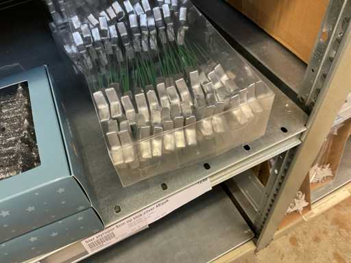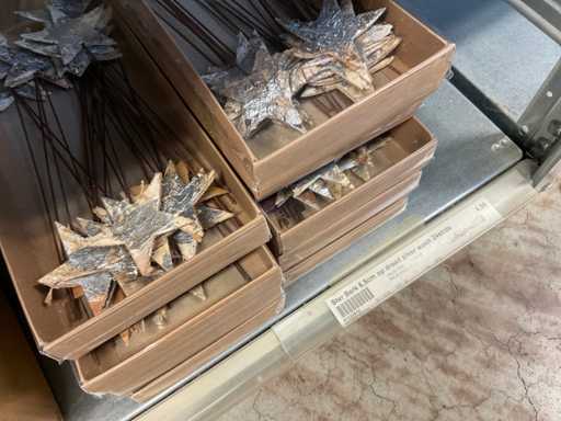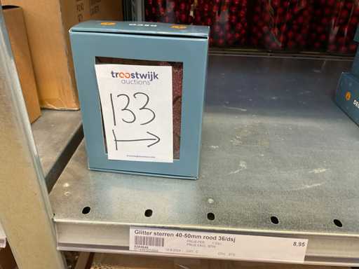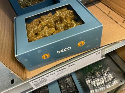 Constând din veveriță de sticlă și ciupercă, stele de lemn, mere deco, stele pe băț, toate în 3 secțiuni de rafturi.