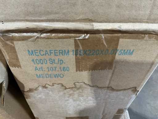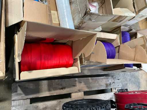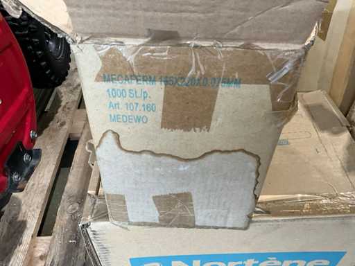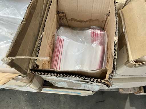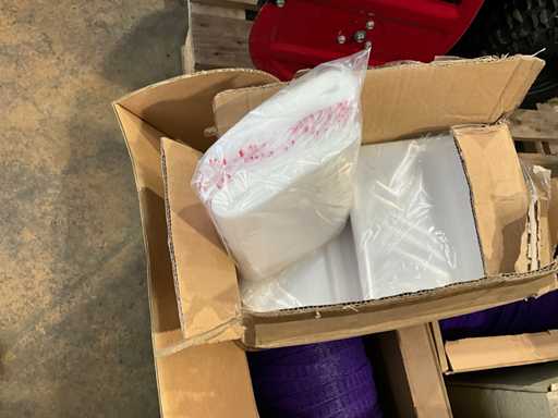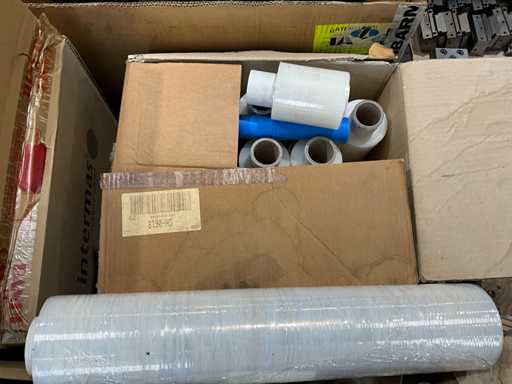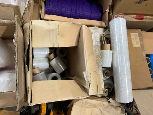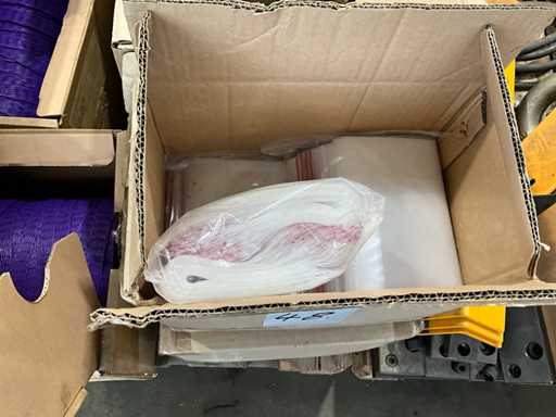 Pe 1 palet, 3 cutii cu manșoane de plasă, aproximativ 31/2 cutii de mini pungi de mâner de diferite dimensiuni, 3 role de carton de folie termocontractabilă, greutate estimată aproximativ 60 kg, cantitate și detalii suplimentare vezi fotografii
