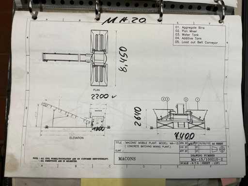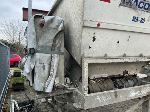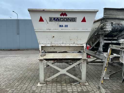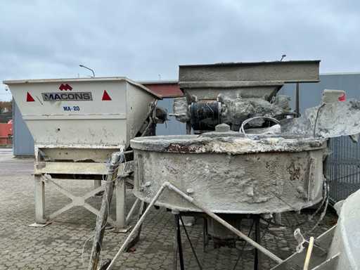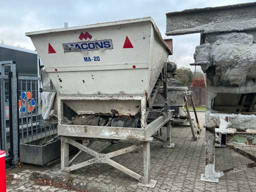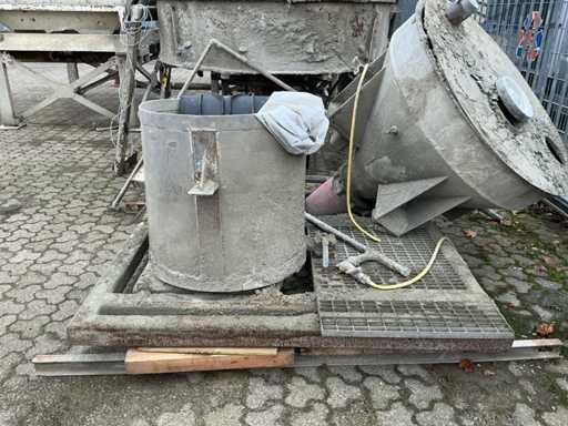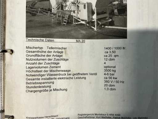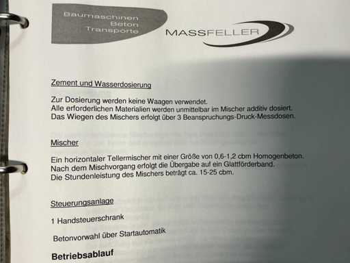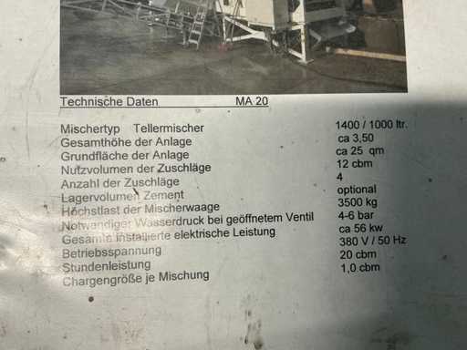 Constă din: mixer orizontal de 1400Ltr, 4 benzi de alimentare pentru 4 fracții, maxim. Încărcătură de 3500kg, presiune necesară a apei 4-6 bar, putere electrică aprox. 56kW, producție aprox. 20M3/oră, loturi mari pe amestec aprox. 1000Ltr, motor mixer 30kW, referitoare la o mașină deja demontată, gata de transport, documentație disponibilă, manual de utilizare, diagrame.