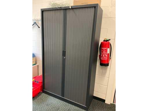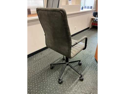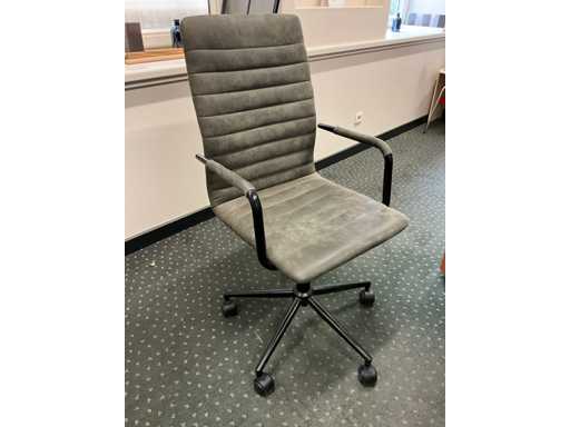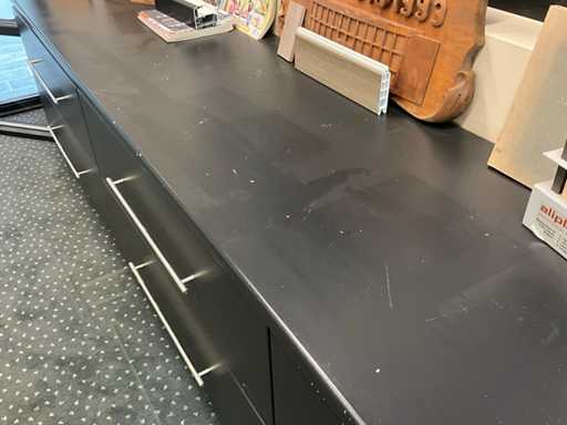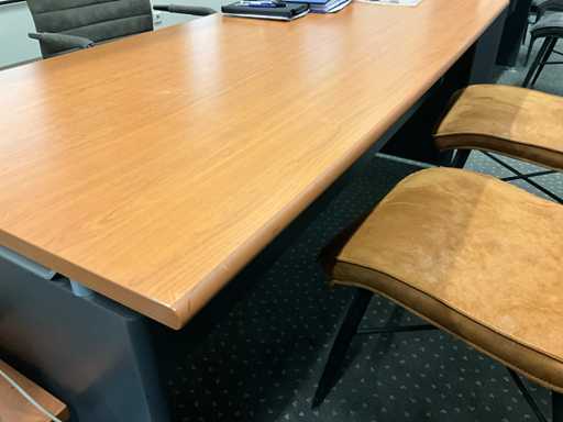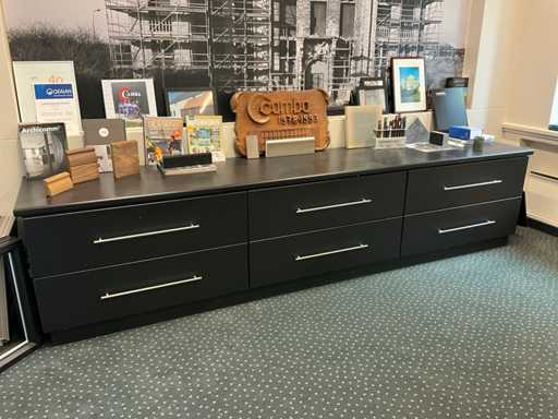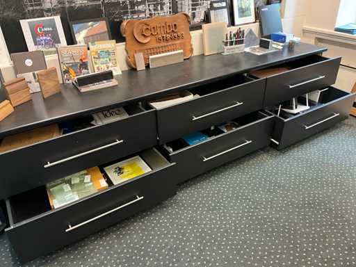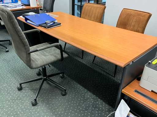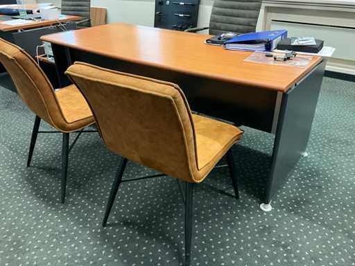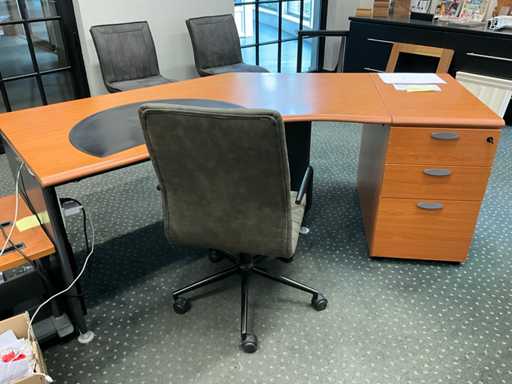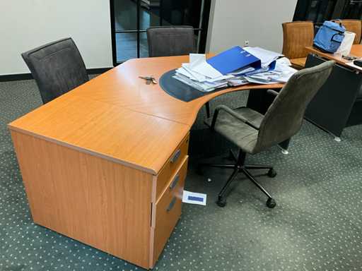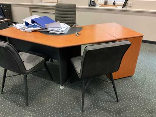 Include 2x birou de colț de aproximativ 210 x 145 cm cu sertar fix și 1x birou de scris aproximativ 180 x 80cm, Complet cu 1x masă de imprimantă de aproximativ 60 x 50 x 44 cm, 1 cutie de rulou metalic model înalt, 3 scaune dactilografe din material textil (gri), 4 scaune laterale idei (gri), 2 scaune laterale idei (coniac) și 1 comodă din lemn cu 6 sertare dimensiuni aproximativ 330 x 65 x 75 cm