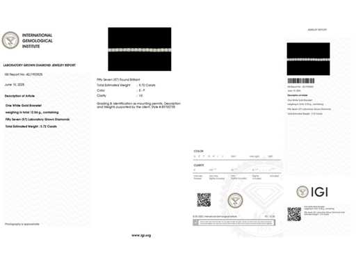 Caracteristici unice: - Metal: aur alb de 14 kt 10,90 g Diamante: 57 bucăți, tăietură strălucitoare, total 5,72 ct Culoare: E - F Claritate: SUA - Certificat IGI: 42J1903525 Lungime: 17,50 – 18,00 cm Vizualizare cu programare