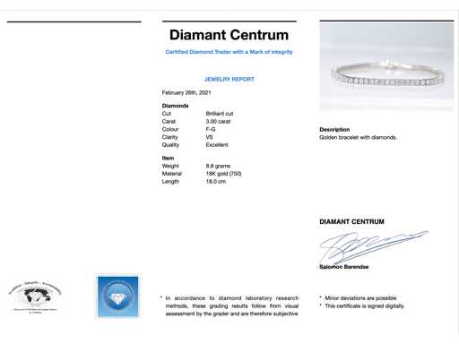 carate Diamant: Natural; Tăietură: Tăietură genială; Greutate (carate): 3,00 carate; Culoare: F-G; Puritate: SUA; Tăietură: Excelent; Bijuterie: Brățară; Greutate: 8,8 uncii; Dimensiuni/lungime: 17-18 cm; Material: aur 18K (750); Starea: Nouă; Ambalare: Cutie de bijuterii de lux; Explicație: Calitatea a fost preluată din raportul aferent produsului. Evaluarea este o evaluare a unui comerciant certificat de diamante, bazată pe prețurile pentru consumatori; Preț pentru consumatori: € 16.293