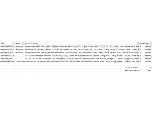 Aceasta se referă la un lot de televizoare returnate de la un mare retailer online. Petrecerea este formată din televizoare de diferite dimensiuni. Număr de piese: 6. Valoare de vânzare în retail: €2070,- Televizoarele nu funcționează și pot fi folosite pentru piese. Vino în ziua vizionării pentru a înțelege motivul revenirii. Vezi fotografiile pentru lista conținutului.