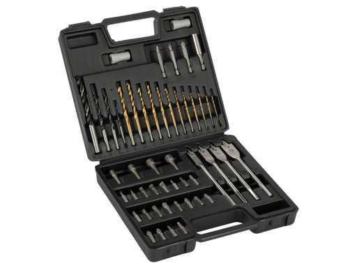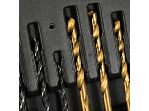 - 12x burghii HSS acoperite cu staniu: 1,5, 2, 2,5, 3, 3,2, 3,5, 4, 4,5, 4,8, 5, 5,5 și 6 mm