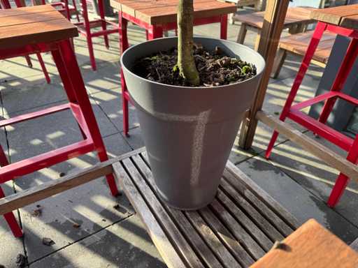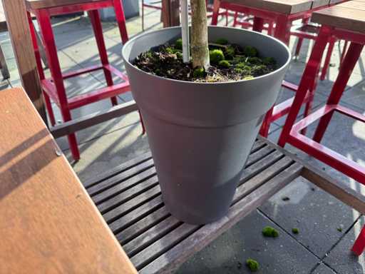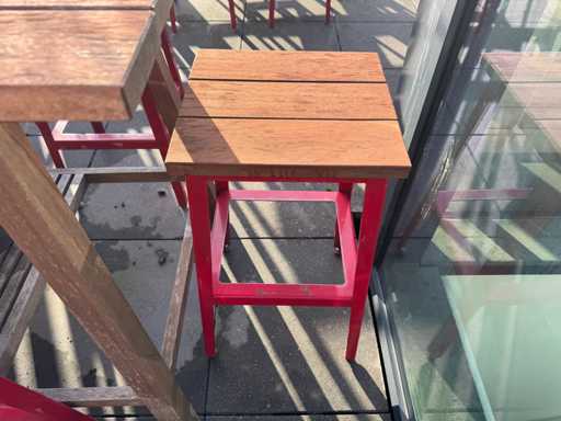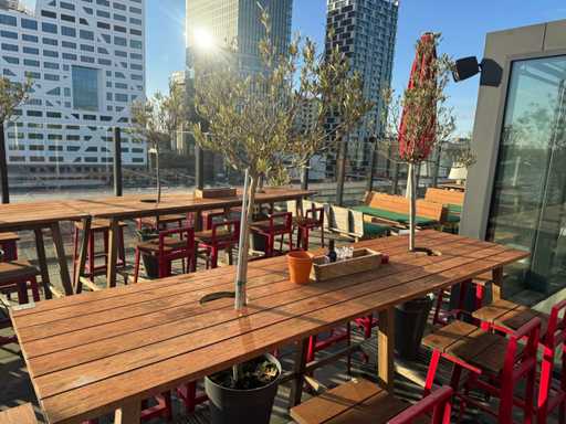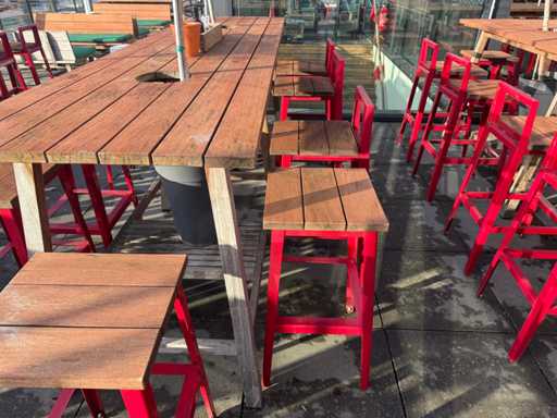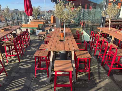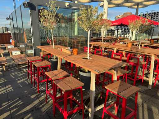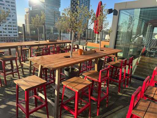 Masă de bar cu copaci, cu 10 scaune (3x scaune cu spătar, 7x fără spătar). Scaunele înălțimea scaunului: 75 cm. PRUDENȚĂ! Lotul este situat pe terasa acoperișului.