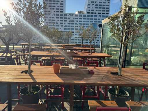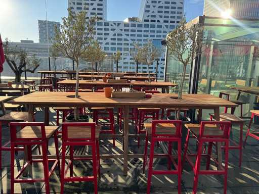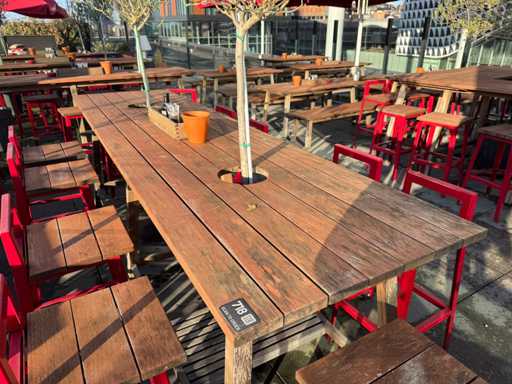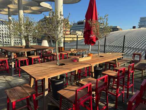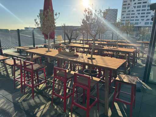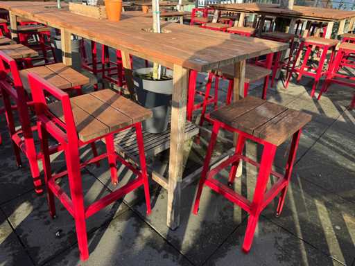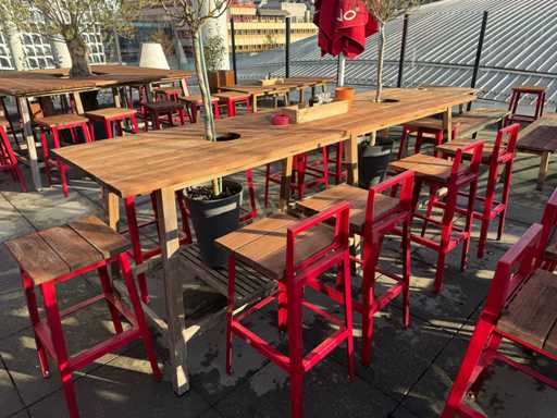 Masă de bar cu copaci, cu 8 scaune (8 scaune cu spătar). Scaunele înălțimea scaunului: 75 cm. PRUDENȚĂ! Lotul este situat pe terasa acoperișului.