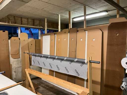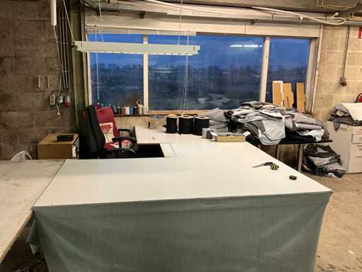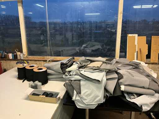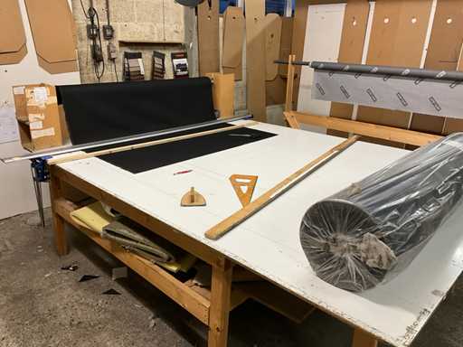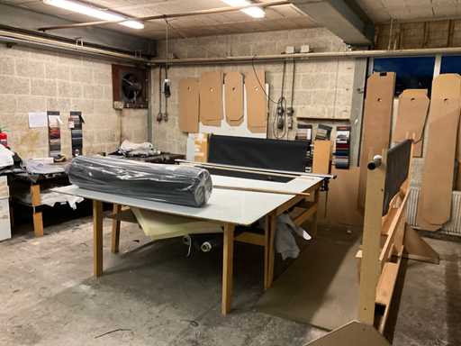 Camera de tapițerie cu mese de lucru, tambur cu role, stoc de țesături și accesorii