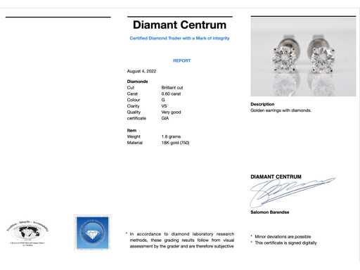 carate Diamant: natural; Cantitate: 2 piese; Tăietură: Tăietură genială; Greutate (carate): 0,60 carate; Culoare: G; Puritate: SUA; Calitatea tăieturii: Foarte frumoasă; Certificat: GIA; Bijuterie: cercei; Greutate: 1,6 uncii; Material: aur 18K (750); Starea: Nouă; Ambalare: Cutie de bijuterii de lux; Explicație: Calitatea a fost preluată din raportul aferent produsului. Evaluarea este o evaluare a unui comerciant certificat de diamante, bazată pe prețurile pentru consumatori; Preț pentru consumatori: 5.775 €