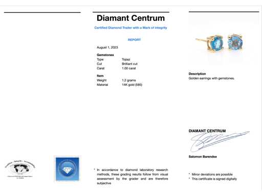 piatră prețioasă de topaz: topaz; Tăietură: Tăietură genială; Greutate (carate): 1,00 carate; Bijuterie: cercei; Greutate: 1 gram; Material: aur 14k (585); Starea: Nouă; Ambalare: Cutie de bijuterii de lux; Explicație: Calitatea a fost preluată din raportul aferent produsului. Evaluarea este o evaluare a unui comerciant certificat de diamante, bazată pe prețurile pentru consumatori; Preț pentru consumatori: 805 €,-