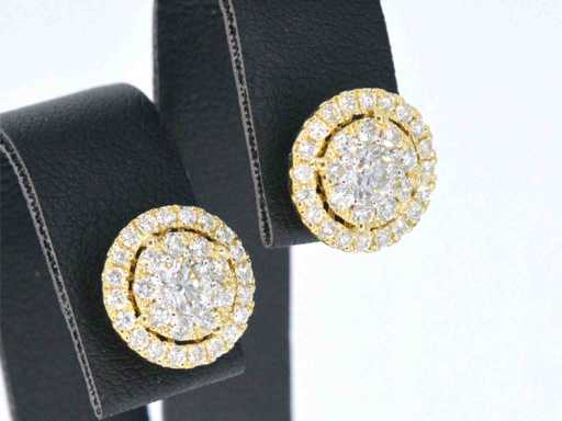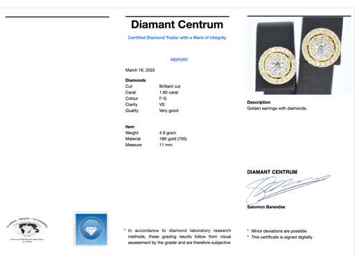 Diamant: Natural; Tăietură: Tăietură genială; Greutate (carate): 1,60 carate; Culoare: F-G; Puritate: SUA; Calitatea tăieturii: Foarte frumoasă; Bijuterie: cercei; Greutate: 4,9 grame; Dimensiuni/lungime: Diametru: 11 mm; Material: aur 18K (750); Starea: Nouă; Ambalare: Cutie de bijuterii de lux; Explicație: Calitatea a fost preluată din raportul aferent produsului. Evaluarea este o evaluare a unui comerciant certificat de diamante, bazată pe prețurile pentru consumatori; Preț pentru consumatori: € 11.078