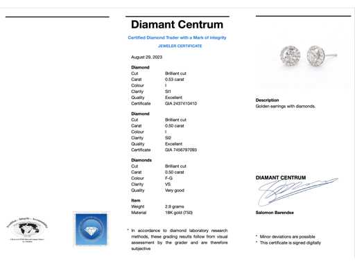 carate Diamant: natural; Cantitate: 1 bucată; Tăietură: Tăietură genială; Greutate (carate): 0,50 carate; Culoare: I; Puritate: SI2; Tăietură: Excelent; Certificat: GIA; Numărul certificatului: 7456797093; Diamant (secundar): Diamant; Numărul de rombo: 1 piesă; Tăietură: Tăietură genială; Greutate (carate): 0,53 carate; Culoare: I; Puritate: SI1; Tăietură: Excelent; Certificat: GIA; Numărul certificatului: 2437410410; Diamant (secundar): Natural; Numărul de diamante: 32 de piese; Tăietură: Tăietură genială; Greutate (carate): 0,50 carate; Culoare: F-G; Puritate: SUA; Calitatea tăieturii: Foarte frumoasă; Bijuterie: cercei; Greutate: 2,9 uncii; Material: aur 18k (750); Starea: Nouă; Ambalare: Cutie de bijuterii de lux; Explicație: Calitatea a fost preluată din raportul aferent produsului. Evaluarea este o evaluare a unui comerciant certificat de diamante, bazată pe prețurile pentru consumatori; Preț pentru consumatori: 7.920 €
