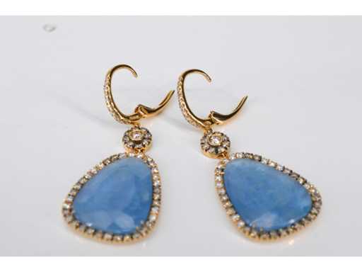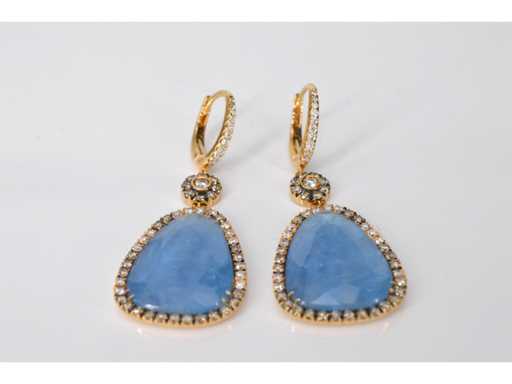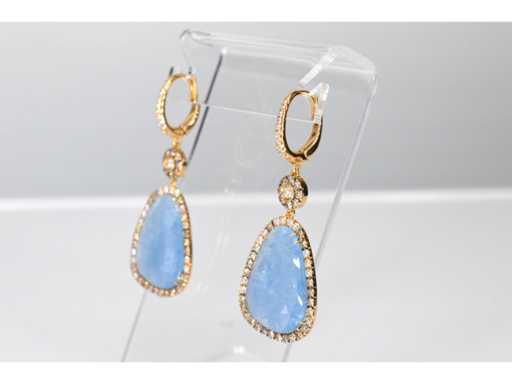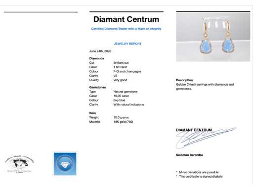Diamant: natural; Tăietură: Tăietură genială; Greutate (carate): 1,60 carate; Culoare: F-G și șampanie; Puritate: SUA; Calitatea tăieturii: Foarte frumoasă; Piatră prețioasă: Topaz; Cantitate: 2 piese; Greutate (carate): 10,00 carate; Culoare: albastru cer; Puritate: Cu incluziuni naturale; Bijuterie: cercei; Marcă: Crivelli; Greutate: 10 grame; Dimensiuni/lungime: 4,5 cm; Material: aur 18K (750); Starea: Ca nouă; Ambalare: Cutie de bijuterii de lux; Explicație: Calitatea a fost preluată din raportul aferent produsului. Evaluarea este o evaluare a unui comerciant certificat de diamante, bazată pe prețurile pentru consumatori; Preț pentru consumatori: € 7.875