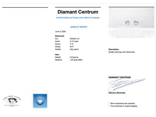 inimă Diamant: natural; Tăietură: Tăietură genială; Greutate (carate): 0,10 carate; Culoare: F-G; Puritate: SI-P; Calitatea tăieturii: Foarte frumoasă; Bijuterie: cercei; Greutate: 0,9 grame; Material: 14 carate (585); Starea: Nouă; Ambalare: Cutie de bijuterii de lux; Explicație: Calitatea a fost preluată din raportul aferent produsului. Evaluarea este o evaluare a unui comerciant certificat de diamante, bazată pe prețurile pentru consumatori; Preț pentru consumatori: 840 €,-