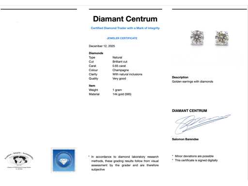 Diamant: natural; Cantitate: 1 bucată; Tăietură: Tăietură genială; Greutate (carate): 0,65 carate; Culoare: Șampanie; Puritate: Cu incluziuni naturale; Calitatea tăieturii: Foarte frumoasă; Bijuterie: cercei; Greutate: 1 gram; Material: aur 14k (585); Starea: Nouă; Ambalare: Cutie de bijuterii de lux; Explicație: Calitatea a fost preluată din raportul aferent produsului. Evaluarea este o evaluare a unui comerciant certificat de diamante, bazată pe prețurile pentru consumatori; Preț pentru consumatori: € 1.840