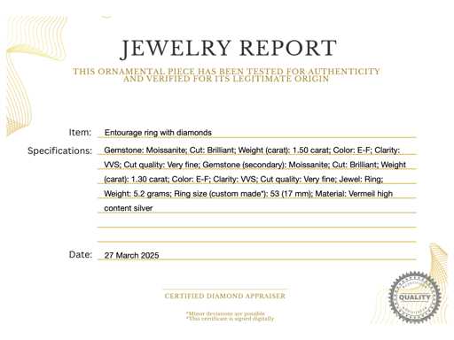 pietre prețioase strălucitoare: Moissanit; Tăietură: Tăietură genială; Greutate (carate): 1,50 carate; Culoare: E-F; Puritate: VVS; Calitatea tăieturii: Foarte frumoasă; Piatră prețioasă (secundară): Moissanit; Tăietură: Briliant; Greutate (carate): 1,30 carate; Culoare: E-F; Puritate: VVS; Calitatea tăieturii: Foarte frumoasă; Bijuterie: Inel; Brand: Harmony; Greutate: 5,2 uncii; Dimensiunea inelului (realizată la comandă*): 53 (17 mm); Material: Vermeil cu conținut ridicat de argint; Starea: Nouă; Ambalare: cutie de bijuterii sau cutie de catifea; Explicație: Calitatea a fost preluată din raportul aferent produsului. Evaluarea este o evaluare a unui comerciant certificat de diamante, bazată pe prețurile pentru consumatori; Informații suplimentare: Greutatea măsurată a pietrelor prețioase este în funcție de dimensiunile diamantelor; Preț pentru consumatori: 1.000 €