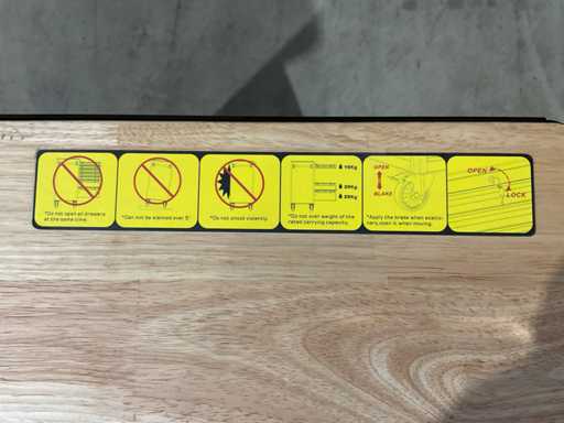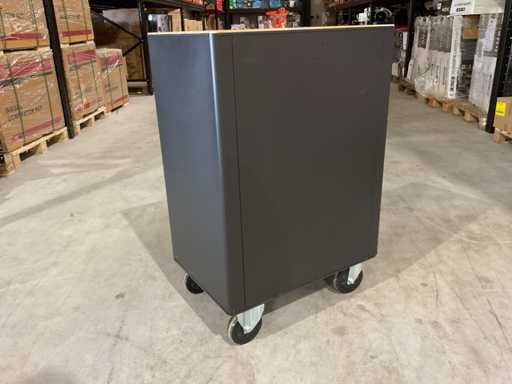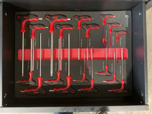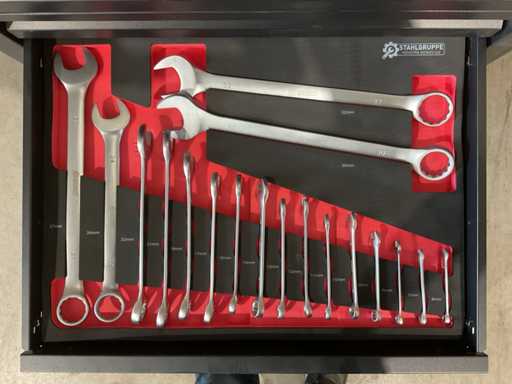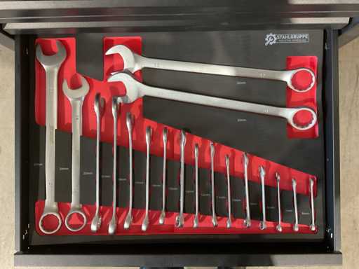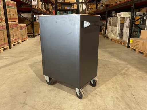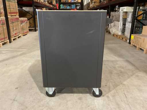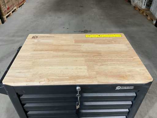 Echipat cu 7 sertare, dintre care 6 sunt pline cu unelte; unelte profesionale din crom-vanadiu; cărucior de unelte pentru rezistență; blat de lucru din lemn; 4 roți; mâner robust; Neutilizat în cutie (dimensiuni de transport 70x50x105 cm)