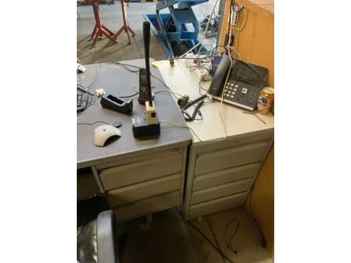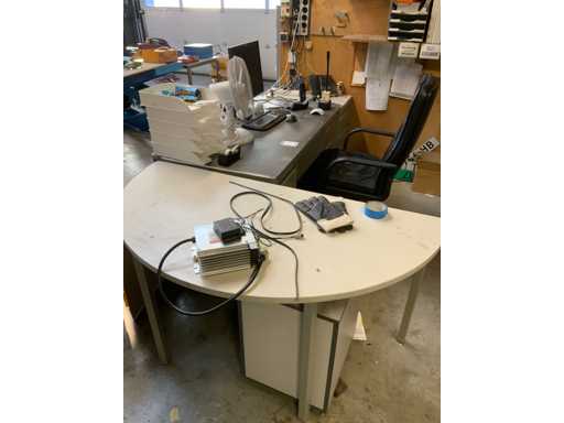 Colțul biroului include conținut, scaun de birou, comode, monitor, ventilator etc