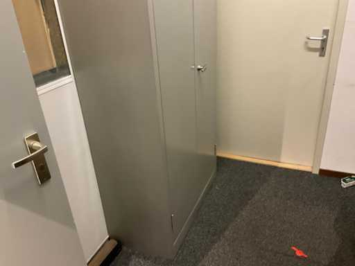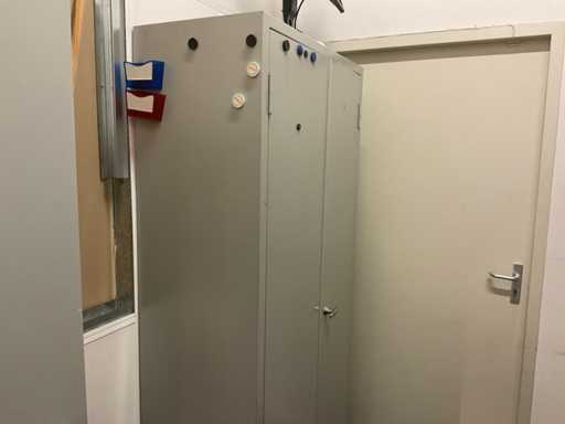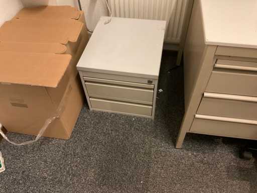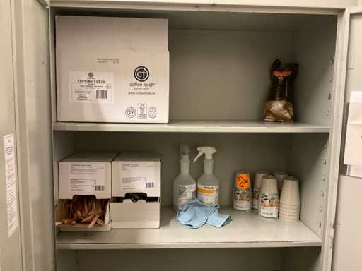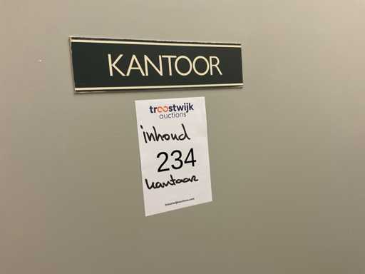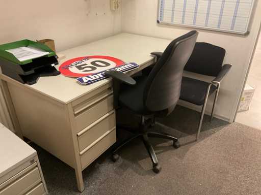 Compus din birou, aproximativ 150x75x75 cm cu 2 scaune, 1 dulap din oțel, aproximativ 92x45x198 cm, inclusiv sertare separată cu conținut și articole de papetărie pe birou.