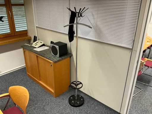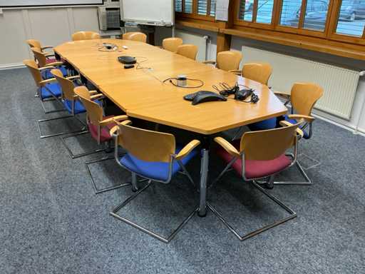 Format din 6x masă, 14x scaun, 4x dulap, 1x tablă albă, 2x sistem de conferințe, sistem de sunet, cuier.