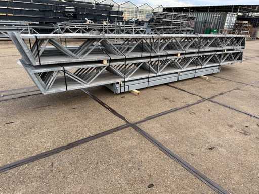 Deschiderea tiei de direcție între grinzi; ferme de casă de 4000mm; secțiune de cutie ca montante verticale și grinzi de grilaj; trasul din oțel; desen 3D; înclinarea acoperișului de 25 de grade; 11 seturi de ferme intermediare; echipat cu tije de legătură cu benzi de suspensie; întărituri și încrucișate; Parcarea este ordonat gata de transport și trebuie ridicată cu o singură remorci; Lotul este încărcat gratuit cu un stivuitor