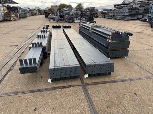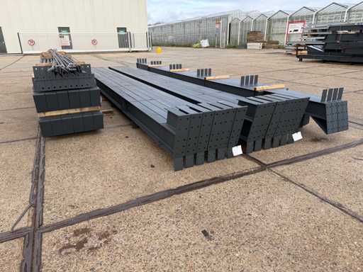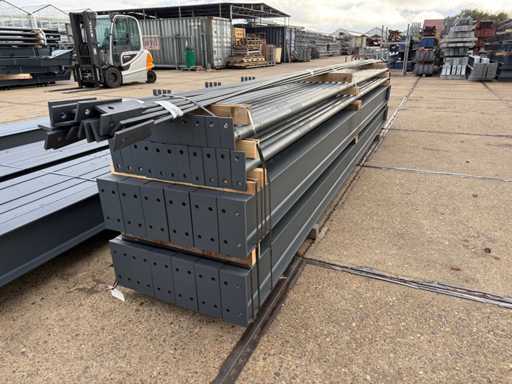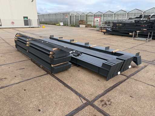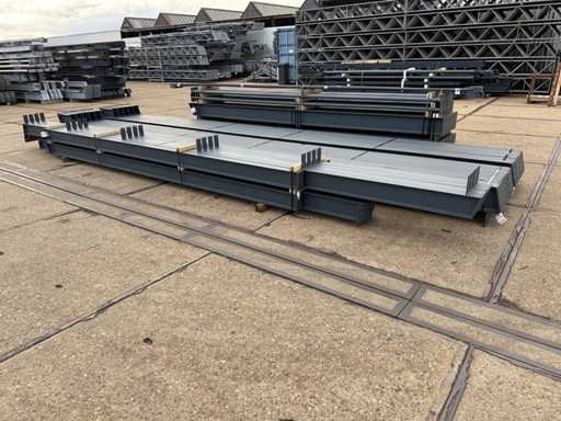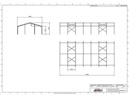 deschidere liberă; ferme C.O.H. 5000mm; panta acoperișului de 15 grade; 6 seturi de ferme intermediare IPE240; 2 seturi de ferme de fațadă IPE180 la capăt cu stâlpi de vânt; trasul din oțel; desen 3D; echipată cu tuburi de presiune; sprijinirea vântului; buze de țeavă pe grinzi; Parcarea este ordonat gata de transport și trebuie ridicată cu o singură remorci; Lotul este încărcat gratuit cu un stivuitor